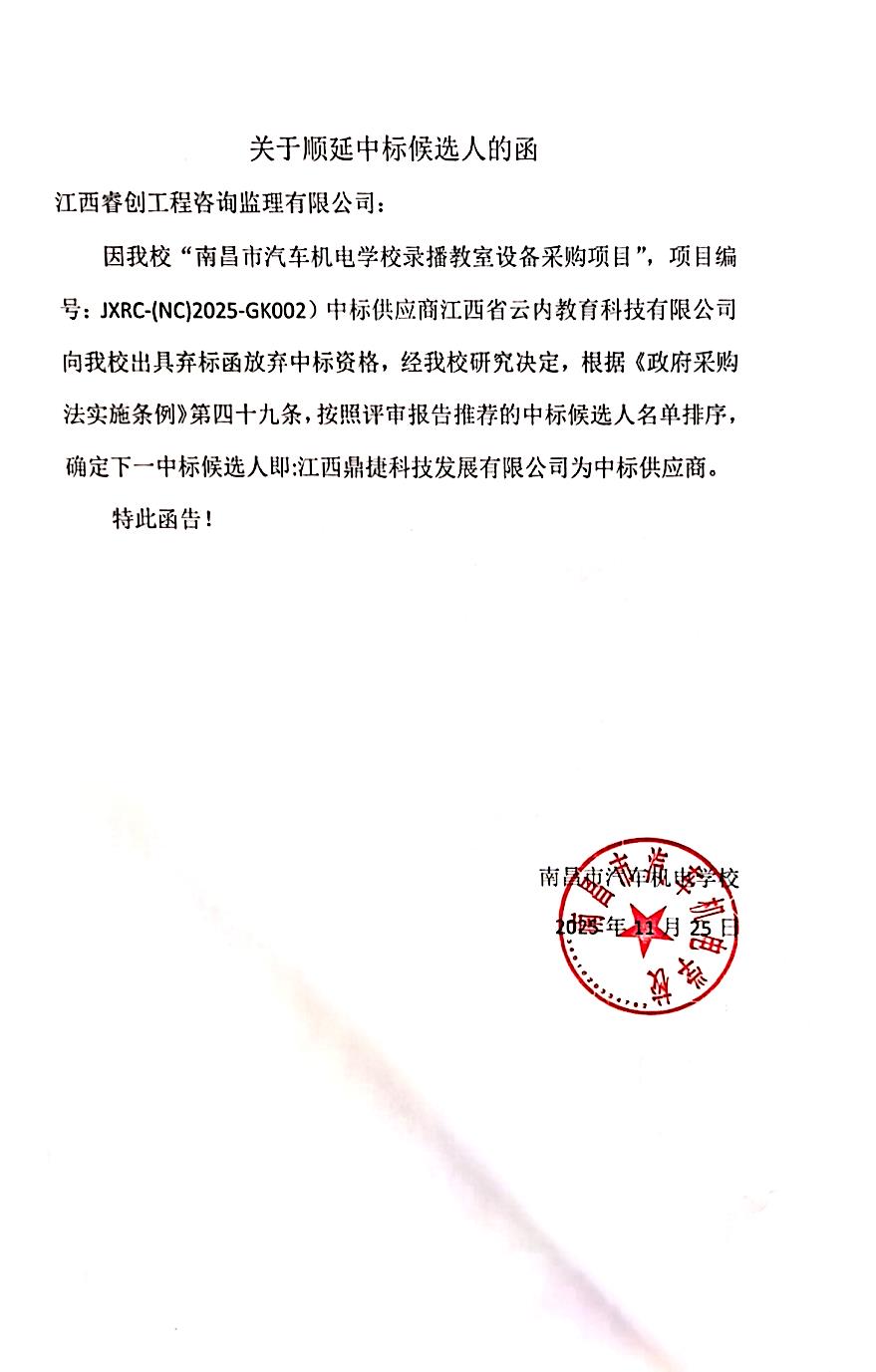 江西睿创工程咨询监理有限公司关于江西省南昌市汽车机电学校录播教室设备(项目编号:JXRC-(NC)2025-GK002)公开招标结果变更公告